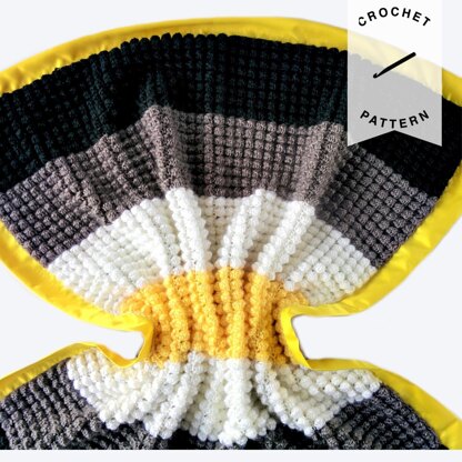 This is a crochet pattern for a simple baby blanket with a satin border. The texture of this thing is amazing. Seriously, I wish you could feel how soft these bobbles are, perfect for little fingers to run through them. The yellow was something I added a little pop of color in the blanket; it’s a happy color that works for little boys and girls. As always, I added a fleece lining (which is covered in little stars!) to finish it off and make it even more snuggly. The name is a bit of a tongue twister but the pattern is SO simple. This crochet pattern will have you making your own bobble blanket for your star in no time!