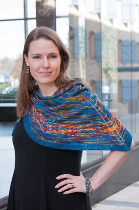 This is an approachable shawl, with clever-but-easily-worked single-row stripes that keep the shades in That Skein from muddying each other. There is a contrasting band of a textural stitch that looks complex but is easily memorized, and
