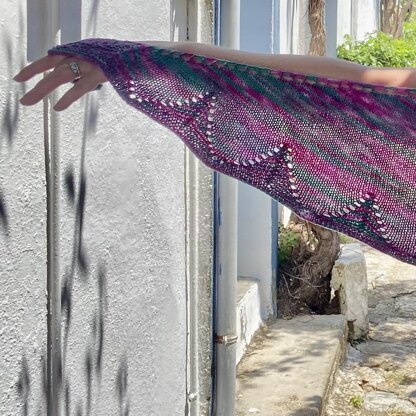 This half-circle shawl was inspired by the street parties of the Royal Jubilee in 2022. The simple shaping and body of stockinette stitch makes it a really nice project to showcase a colourful skein of yarn. Go as bold and bright as you like! When you reach the border, yarnovers and double decreases work together to create triangular pennants along the bottom of the shawl. The sections between are worked in garter stitch to showcase your smooth, colourful ‘bunting’ and to add a final flourish of texture!