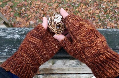 My one-year anniversary as a designer is a time of gratitude and reflection for me. For about 6 months, I have been playing with elongated caliper cables, putting them on a shawl, cowl, hat, and now fingerless mitts.