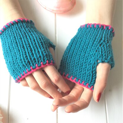 Bronnie fingerless mitts come in two sizes and 3 styles. These mitts were originally designed for a teenager who wanted something a bit more funky with a splash of bright colour. Knitted with chunky/bulky merino yarn for quick and cosy results. Fingers free for play. 3 styles are; - stocking/stockinette stitch mitts, mitts with rib edging, and mitts with blanket stitch edging.