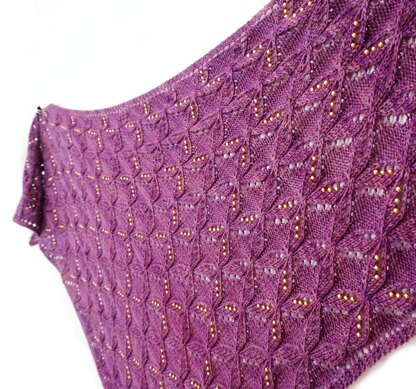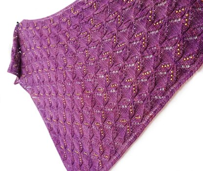 Spinning pinwheels dance across this asymmetrical triangular shawl, accented with optional seed beads. A combination of lace and cables decorate this elegant accessory.