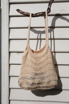 This bag is knit in the round, starting with the base before changing needles for the dropped stitch body of the bag. Bound off edge and handles are I-cord.