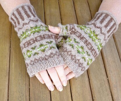 These fingerless mitts are a great way to use small amounts of coloured yarn, but equally could be made with a single contrast colour for a striking design.
