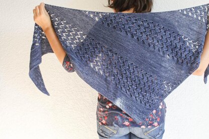 “Brushwood” est un shawl triangulaire, tricoté dans le biais. Son point de dentelle en épine se tricote sur chaque rg (endroit et envers) et offre un joli contraste avec les sections de point mousse.