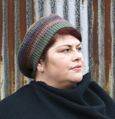 This pattern includes instructions for 2 versions of this hat - my original design in 2 colours and a second version knitted inside out in a variety of colours. The pattern gives exact yardages for each of the yarns used so you can use up precious leftovers for this pattern. The pattern also provides instructions for adding extra depth in the hat if you prefer more slouch than that shown.