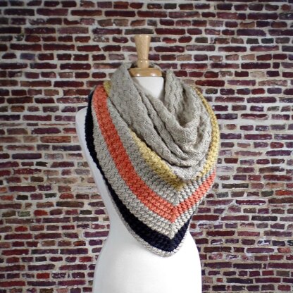 The shawl was designed with the stripes at the bottom, each worked in a different color. Variations on this color scheme, with approximate yardage, are listed at the end of the pattern.