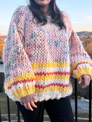 This Chunky Bubble Jumper is super soft, squishy, chunky knit sweater for all those chilly days and nights. This cheerful sweater looks super cute with with contrast strips knit in super chunky yarn. Very easy and knits up quickly. Enjoy some warm, cozy coffee runs with this live-in jumper!! Happy New Season!! Level= Beginner-Intermediate Yarn= Crazy Sexy Wool- Wool and the Gang Or We are Knitters- The Wool. 3 Skiens of Body Color 1 Skien of Each Accent Color Needle- 25mm, 12mm circular needles. Size- One size Approx Finished measurements: Length - 22" Chest- 46"