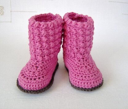 Crochet Pattern for Baby Booties with Cute Bubble Stitch textured cuffs - buttons and loops at the back for easy fastening.