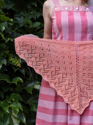 A flirty triangle scarf or shawlette in three sizes (mini/petite/tall), worked from hem to neck, with a deep openwork border of branch and bud motifs. The easy-to-work stitch patterns and wrong-side rest rows make this piece a great first shawl project, or a fun, relaxing weekend traveler for experienced knitters. Its ornate appearance belies the simplicity of its construction; this piece knits up quickly and effortlessly to make a beautiful spring accessory or last-minute gift.