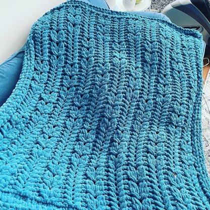 THIS IS A LOOP YARN FINGER-KNITTING PATTERN. The Budding Branches Blanket Pattern has staggered columns of fishtail cables and leaf motifs, with a knit-stitch border.