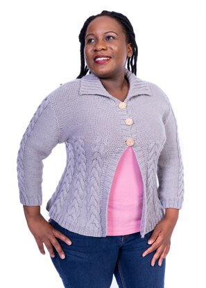 This cardigan is a quick to knit project worked from the top down. The sleeves are worked from the top down with short rows used to shape the sleeve caps. The cardigan features simple yet exciting cables for an engaging, interesting project. The cardigan is fitted around the bust and lightly flared at the bottom for a more flattering fit.