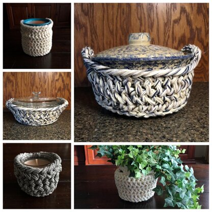 The little black/white basket was knit on a 1/2" gauge loom using approximately 30 yards of Red Heart Cordial yarn, #5 bulky.