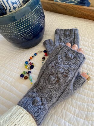 What could be more fun than a cable with eyelets and bobbles? How 'bout a cable that reminds you of a bumble bee in flight? Enter BUMBLE, the best fun you can have with under 60 g of worsted weight yarn. These engaging fingerless mitts work up in a trice and make a great stashbuster. BUMBLE features a fully fashioned thumb gusset, stockinette palm and ribbed edges. Make a pair on the weekend and add a second pair as a gift!
