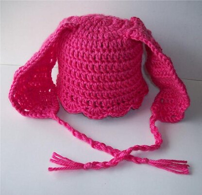 A PDF crochet pattern for a cute bunny hat with optional ties at the end of the ears to make it an earflap hat.