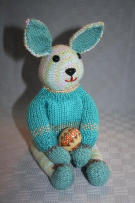 Dressed in his best bright blue sweater Bunso the Charmer is eagerly awating the arrival of Easter and all the wonderful tasty treats the festivities bring. If he is lucky he may even find a mate to help him tie his shoelaces each morning..that is if he shares his carrots and chocolate with her! Bunso is a relatively easy knit. The design is written with pdf increases to create a shaped body and head. His limbs are attached in a different way to be sure they will not become detached. Instructions include photos and many details to enable the knitter to create a replica of Bunso with ease. I used Bernat Softee Baby which is a (3) and the contrasting feet, mittens and inner ears are done in Carons Simply Light (3). His sweater,( including the colour work) is done in Carons Simply Soft (4) for a chunkier look.
