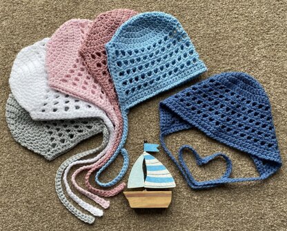 A Vintage inspired Baby Bonnet with a delicate filet crochet design and tie fastening