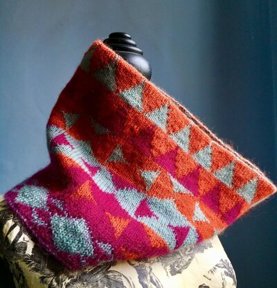 Knitted in the round using the ‘double-knitting’ technique to create a reversible fabric, this cowl is inspired by the colourful houses of the Venetian island of Burano, with geometric motifs based on the typical mosaic floors of the region.
