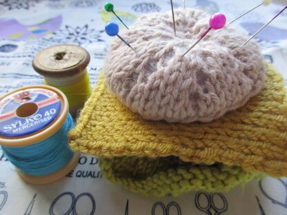 This is a pattern for a burger pin cushion. It is made in separate pieces, apart from the cheese as a circular knit with simple increases. The buns and burger have a top and bottom piece, with toy stuffing. This is a pin cushion, and the pieces are pulled together by a thread from top to bottom to secure. This would also make a fun ornament. If you want to use it for play food, leave the pieces separate. The pieces can be made bigger by adding more increases to the circular pieces following the same sequence