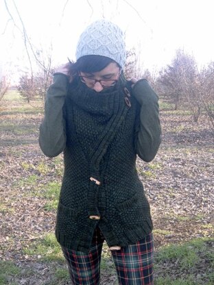 Burton is a very quick and easy textured cowl-neck garment mostly worked flat, from the top down. The pattern starts by working the shoulders to the underarms, then the front and back are joined together and the body worked in one piece. The vestigan features a basic seed stitch pattern, ribbed edging, short rows to shape the cowl-neck and horizontal set-in pockets. The garment is intended to be worn with positive ease at the chest for a comfy fit. Sample worn with 2½ inches/ 6cm of positive ease.