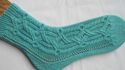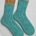 This is a pattern for a pair of socks that is knit from the top (cuff) down on two circular needles, with an optional 12-inch needle. The socks themselves are created using a single very ornate cable stitch that is quite unique insuring that cable knitters will love them. There is just a touch of faggotting in them to insure a proper fit. The cable stitch comes to us from the Shetland Islands. The cables add both a little warmth and durability to the socks, as well as show off your knitting prowess. The cables make quite a statement. If you want them to be a little more subtle, knit the socks in a more muted color.