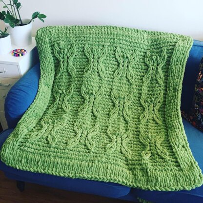 THIS IS A LOOP YARN FINGER-KNITTING PATTERN. The Butterfly Baby Blanket Pattern is a repeating pattern of butterfly motifs with raised antennae, surrounded by a thick knit-stitch border. NOTE: While this pattern is written for Alize Puffy yarn, UK knitters can substitute Bernat Alize Blanket-EZ yarn for a blanket of approximately the same size - you will only need 4 skeins.
