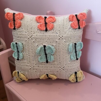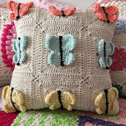 My Butterfly Granny Square Pillow is one of my book cover inspired pillows. It is inspired by the cover of Julia Alvarez's book, In the Time of the Butterflies. The front is composed of nine 3D butterfly granny squares. The back is simply a pink traditional granny square. I couldn't resist adding some pink! The pillow is joined with a single crochet stitch along three sides of the pillow, and the bottom is held together by five buttons. This allows the pillow to be taken on and off of the insert. There are step by step photos included in the pattern. I used MillaMia Naturally Soft Cotton yarn for this project, but any sport weight yarn would work.