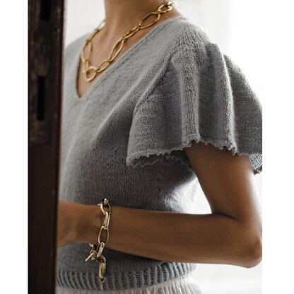 Butterfly Sweater is v-neck sweater with flutter sleeves. It comes with two different sleeve edging options: a tiny picot edge and a smooth edge. It is worked seamlessly from the top down. The neckline is worked at the same time as the body, there is no further finishing at the neckline. The wide sleeves are balanced by a fitted body. No short rows are used in the pattern.
