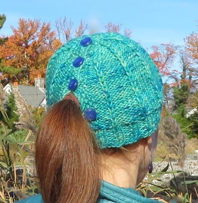 This fun hat knits up fast, even for a beginner. The button band allows you to wear your ponytail high, low, or in between and still keep your head warm and cozy. Just undo a button wherever you want your ponytail to stick out. Or wear it with a “messy bun” by undoing two buttons instead of just one.