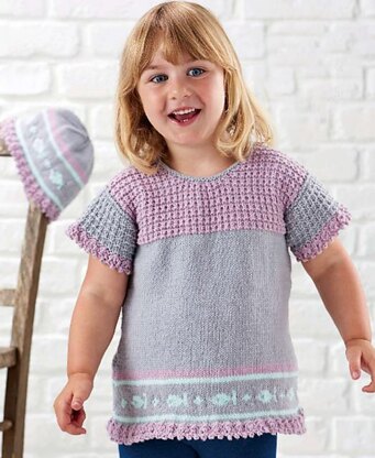 Little ones will love this seaside outfit, with a sweet hat and tunic. You can really make the set your own by mixing and matching the colours, and add a bit of frill to the thrill of sand castle building and ice cream eating. The broken rib texture is also worked on the back of the tunic, with a cute button loop detail on the neck - this makes it easier to get little ones ready for a fun day out.