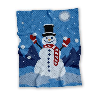 Snowman Blanket made with the Corner-to-Corner (C2C) crochet technique. The cheerful design features a smiling snowman with a tall black hat, bright red mittens, and a patterned scarf. A festive and cozy project, ideal for holiday décor, Christmas gifts, or as a seasonal throw.