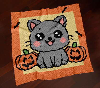 C2C CROCHET PATTERN Halloween Pumpkin Kitten Blanket Gray Cat Afghan Spooky Lapghan