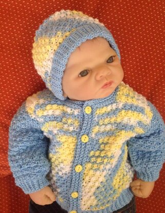 The jacket was worked with one 100grs. variegated skein and one 100grs solid color skein. Enough yarn was left over to crochet a matching beannie.