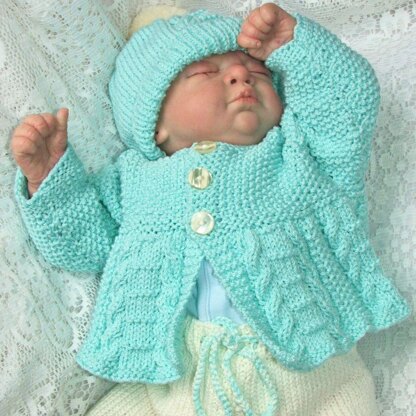Create an adorable and traditional look for your baby with our sweet and stylish knitting pattern which includes a cabled matinee jacket, leggings, and a pompom hat, all knitted in DK yarn. The Jacket is knitted in one piece from the bottom up (sleeves are knitted separately), and the leggings are knitted from the waist down in two pieces. The instructions have each size colour coded to help you follow the pattern