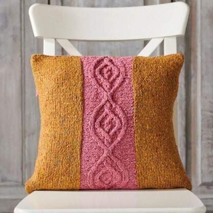 This is a pattern for a cable and intarsia cushion cover, originally published in Simply Knitting. It has a stocking stitch back, the front with a cable panel at the centre and stocking stitch panels on the sides. Moss stitch edges. Photos Simply Knitting.