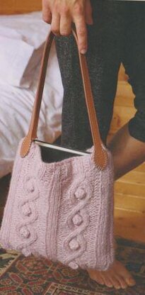 This is a pattern for a cable and rib bag, originally published in Knitting magazine. It has a cable with bobbles pattern and wide ribs, with 2 x 2 rib on the top borders. It is lined with fabric and wadding, with faux leather handles. Photos Knitting magazine.