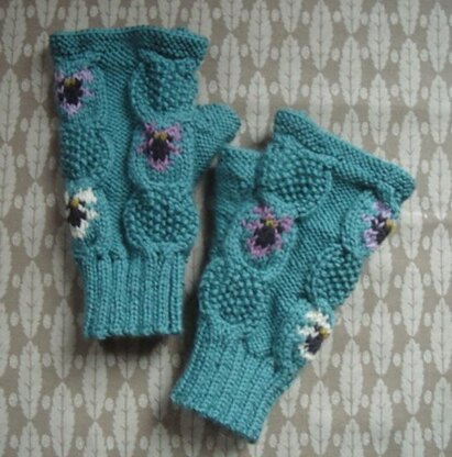 PDF knitting pattern for a pair of fingerless gloves in reverse stocking stitch with panels of alternating stocking stitch and moss stitch horseshoe-shaped cables. Intarsia violets are knitted inside the stocking stitch cables - but these could be added afterwards using duplicate stitch or left out altogether if one-colour cabled mitts are preferred.