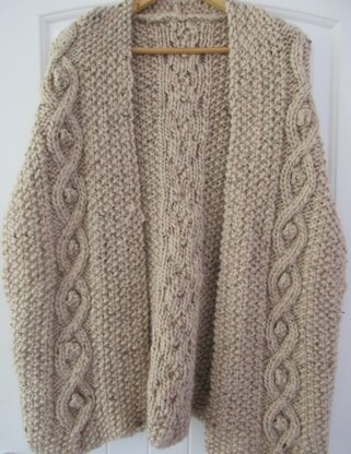 This is a pattern for a cable gilet/cape, originally published in Knitting magazine. It is made with a chunky yarn in an easy to wear shape to add a layer for autumn/winter. Length 70-74 cm.