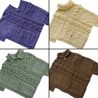 The poncho features panels of seed stitch, cable and stockinette. Design your own by choosing from 5 different cables and 4 neckline finishes.