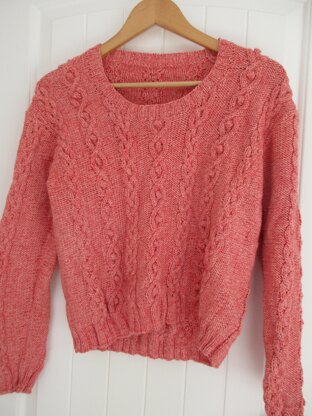 This is a pattern for a cable sweater, originally published in Simply Knitting. It has two different cables repeated across the garment. The style is casual in a cotton denim yarn.