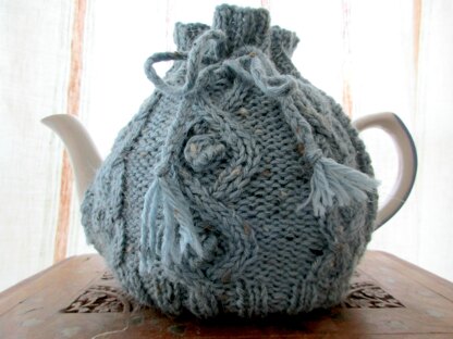 This is a pattern for a cable tea cosy, originally published in The Knitter. It has two cable patterns and rib borders, and is fastened with a tie through eyelets.