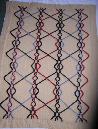 The cables in this are worked in intarsia so it's reversible. This means you will be working 17 strands of yarn on each row. The sample required 7 balls (208 yds/190 m each) of the background color and about 130 yds/119 m each of blue, yellow, green, and brown for the cables.