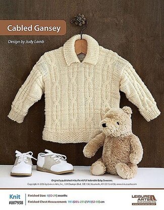 Leisure Arts Adorable Baby Sweaters Cabled Gansey Knit ePattern- Keep those precious bundles of joy warm and cozy with this cute design. Knitted using 3 light weight yarn, US size 3, 3.25mm and 6, 4mm straight needles. Fits babies 6-24 months. 3 sizes to choose from. Largest measures approximately 23.25" around chest. Includes diagram, assembly and finishing instructions. Easy skill level. Originally published in Adorable Baby Sweaters 5737. 12 pages, PDF download.