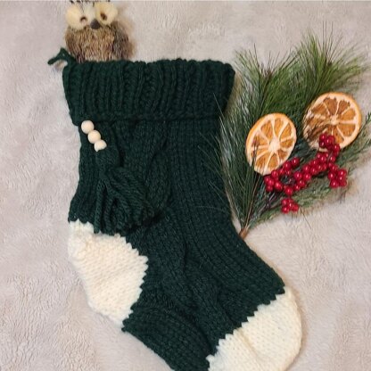 The stocking is knit top down, in the round, starting with a Ribbed section before moving into a cabled design. Heel is made with an after thought heel to facilitate keeping the cable smooth.