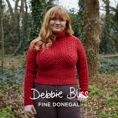If you're looking for a timeless cosy cabled sweater with turtle neck, and a deep ribbed hem, this is it! Richly cabled, with lots to engage you from cast on to cast off, Cabled Sweater is a great knitting project for knitters who love texture. Shown here in Strawberry, with rich earthy neps, this gorgeous cable knit would looks so fabulous in any of the Debbie Bliss Fine Donegal or Debbie Bliss Fine Donegal 50g shades to show off those textured stitches! Knitted flat and seamed.