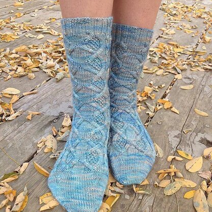 Top-down sock pattern in 2 sizes, with 72 or 76 stitch cast on, increasing in pattern to accommodate cables. Includes charts and written instructions.