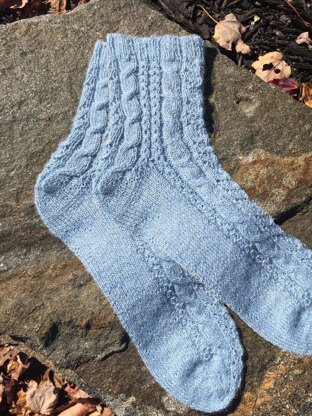 This lightweight, cozy sock pattern shows its design best when worn. The lace and cable design are pretty when they're stretched to a foot and the seamless heel fits perfectly without bulky, uncomfortable stitches. Knit up in North Light Fiber's Forever Lace makes it soft and durable. Color featured is Sky Blue.