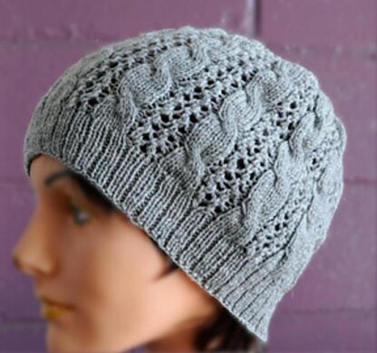This slouch-style hat features alternating bands of eyelets and 3 x 3 cable. It is knit on needles slightly larger than is typical for the yarn to allow for more drape and wearability. See the matching Cables 'n Lace Cowl and Cables 'n Lace Mitts for the whole ensemble.