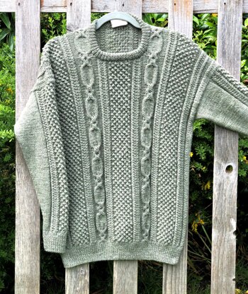 This beautiful Aran style sweater is a calssic for anybody's wardrobe. The stitch detail, with the lovey chain cables and sections of trinity stitch, stand out brilliantly set between the vertical braid effect lines of twist stitches. The neat crew neck, welt and cuffs are in 1/1 rib. Worked bottom up and with full written instructions.