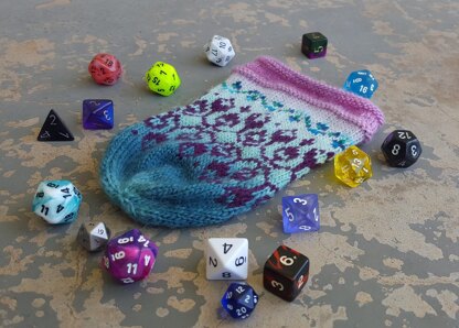 I had this ball of Knit Picks Chroma Fingering sitting in my stash for a year, waiting for the right project which never came. However, I noticed the colorway matched the colors of one firbolg cleric named Caduceus, from Critical Role and I was inspired to design a dice bag! With budding blossoms from the garden and trailing vines, this bag is perfect for slow color changing yarns such as Chroma. Pair with a couple of complementary colors and you get a beautiful bag to store and carry your gaming dice with you!